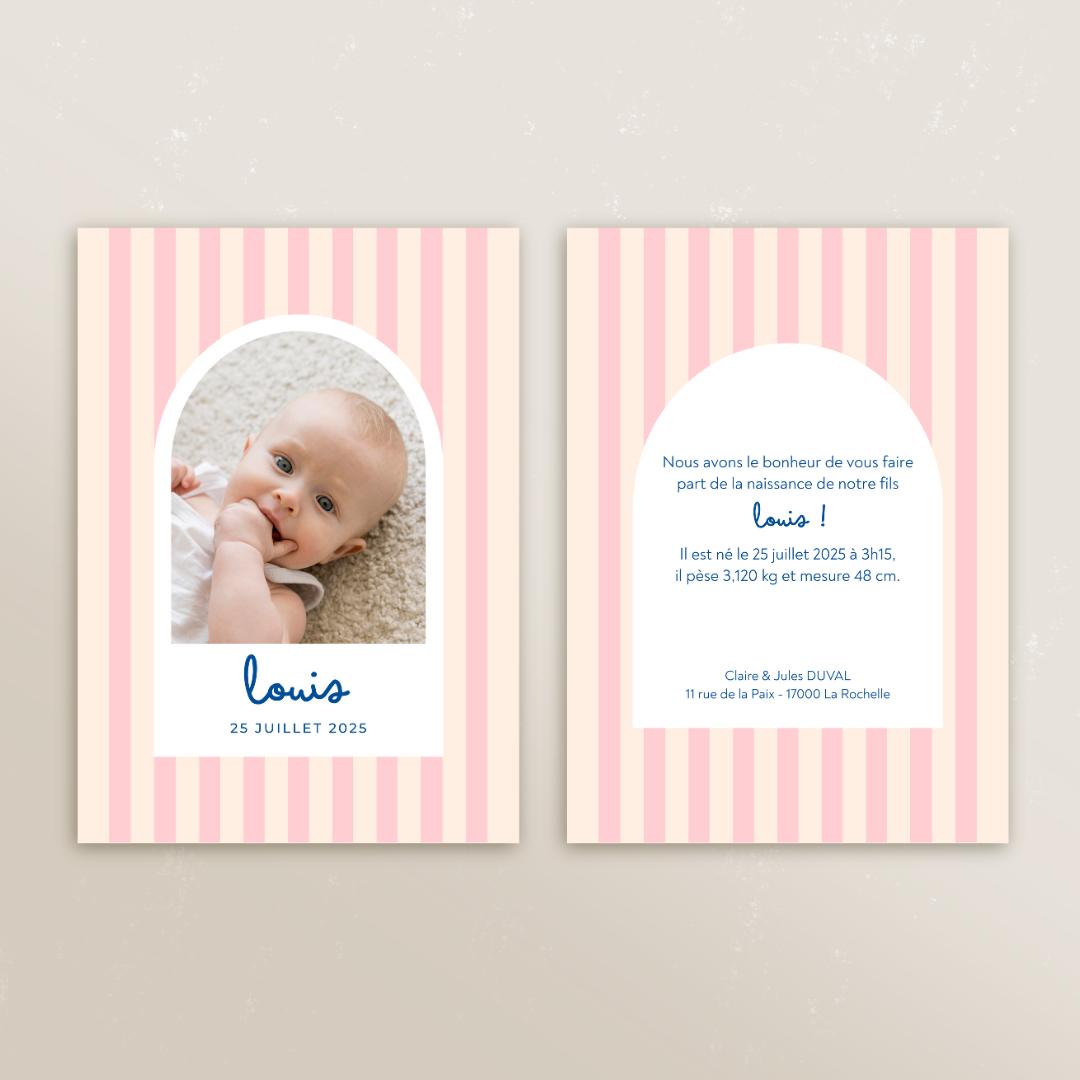 Annoncez cette arrivée avec élégance grâce à notre faire-part au format 10,5 x 14,8 cm (A6), idéal pour vos envois postaux.