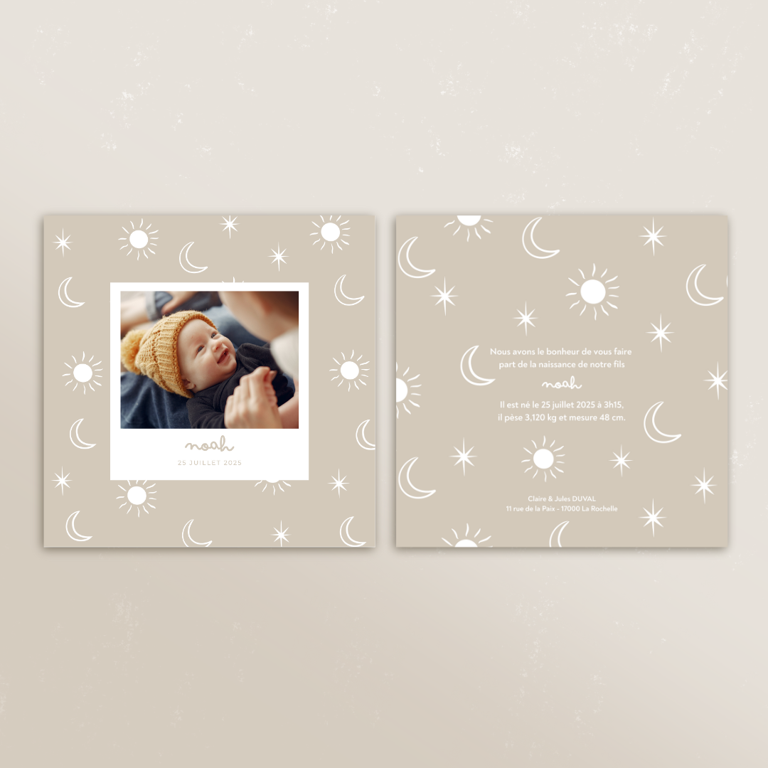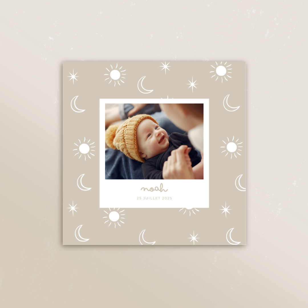 Annoncez cette arrivée avec élégance grâce à notre faire-part carré au format 14,8 x 14,8 cm, idéal pour vos envois postaux.