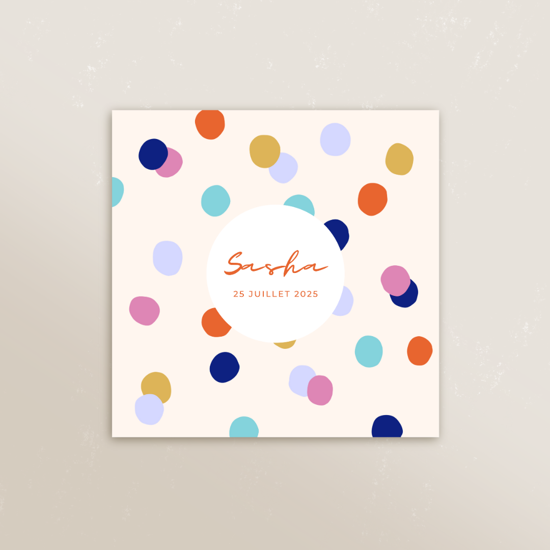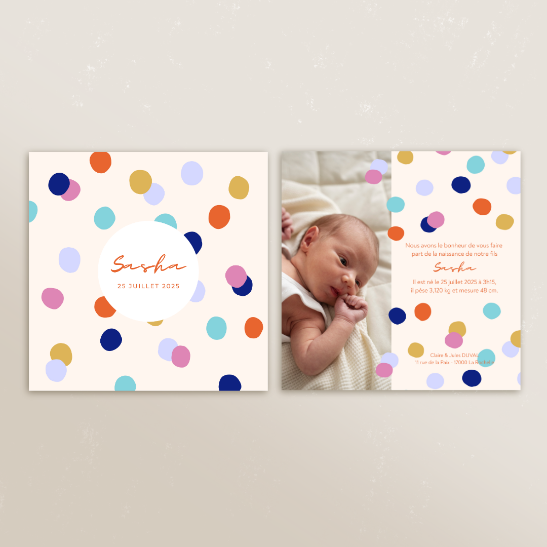 Annoncez cette arrivée avec élégance grâce à notre faire-part carré au format 14,8 x 14,8 cm, idéal pour vos envois postaux.