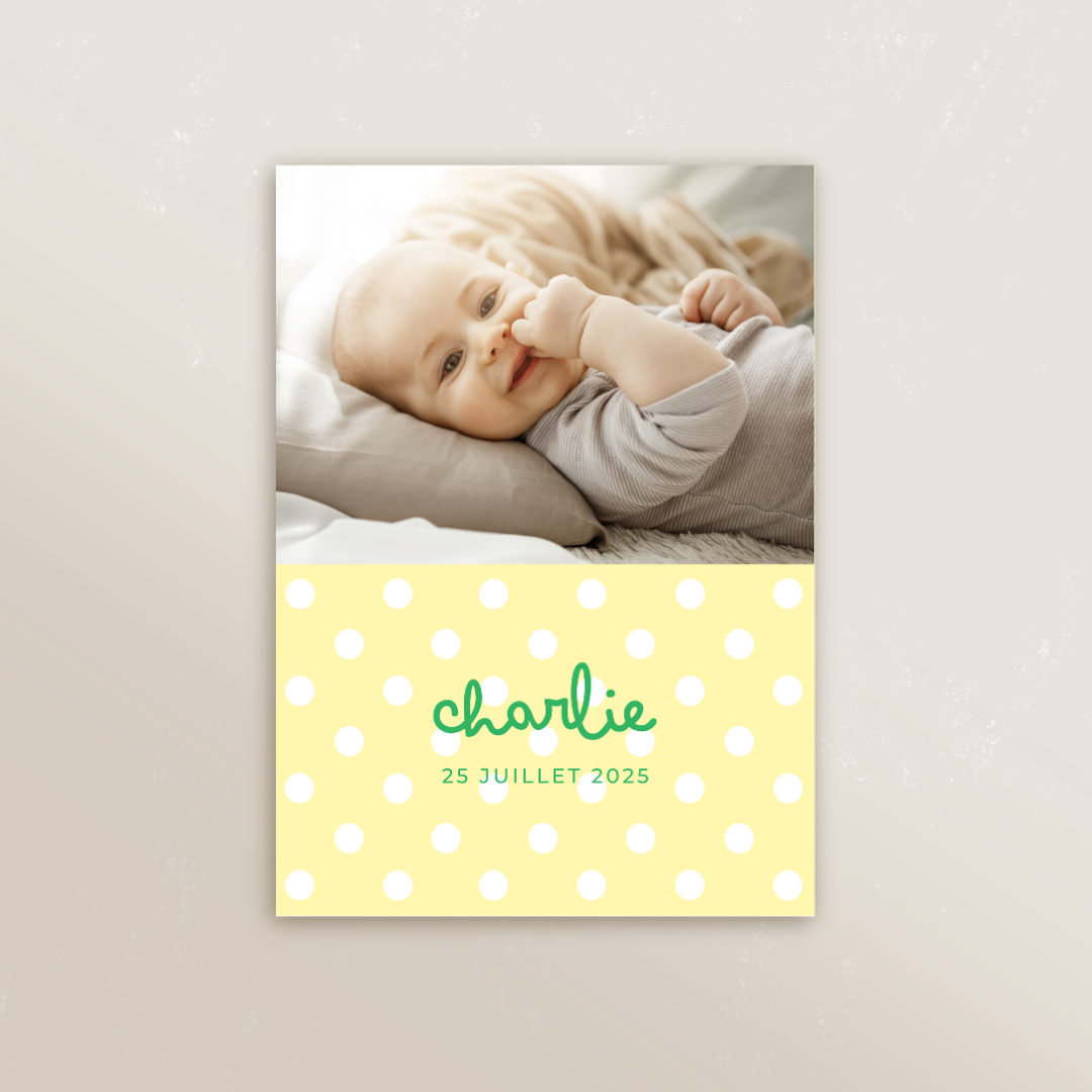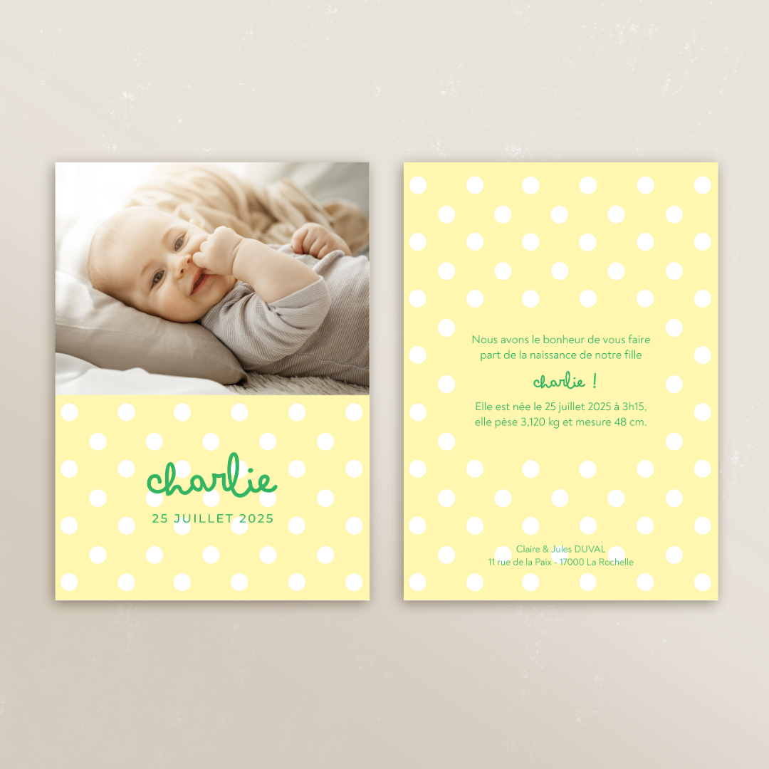 Annoncez cette arrivée avec élégance grâce à notre faire-part au format 10,5 x 14,8 cm (A6), idéal pour vos envois postaux.