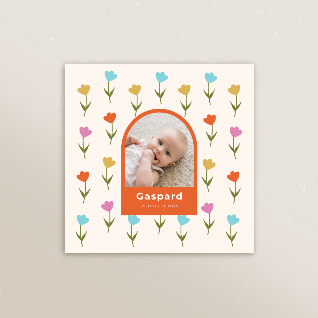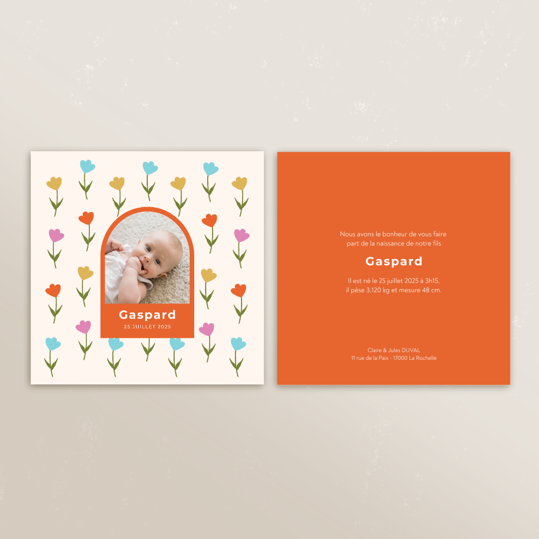 Annoncez cette arrivée avec élégance grâce à notre faire-part carré au format 14,8 x 14,8 cm, idéal pour vos envois postaux.