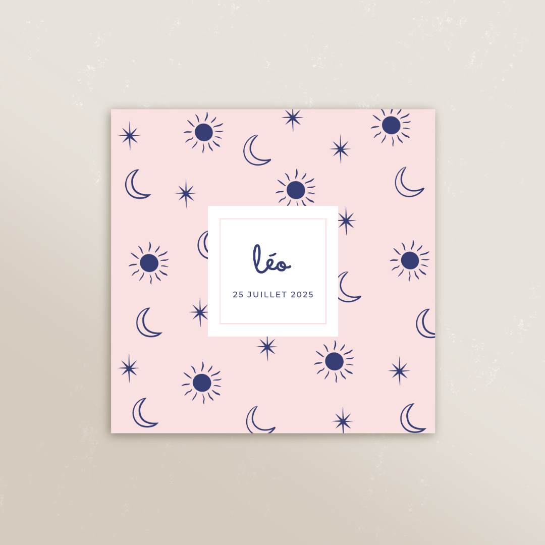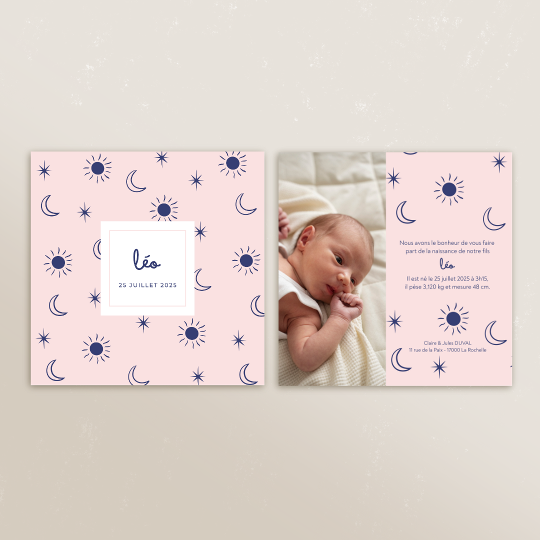 Annoncez cette arrivée avec élégance grâce à notre faire-part carré au format 14,8 x 14,8 cm, idéal pour vos envois postaux.