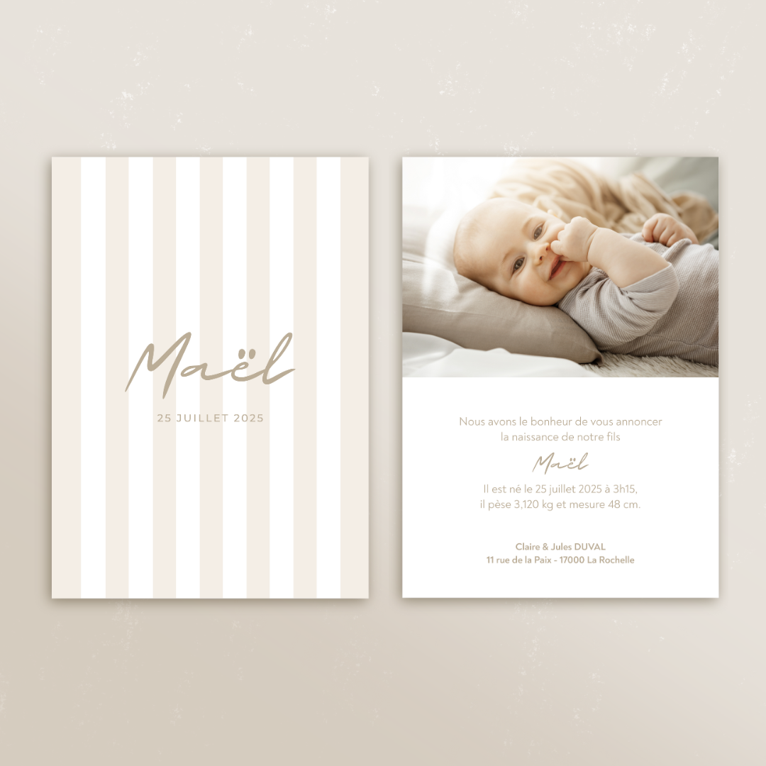 Annoncez cette arrivée avec élégance grâce à notre faire-part au format 10,5 x 14,8 cm (A6), idéal pour vos envois postaux.
